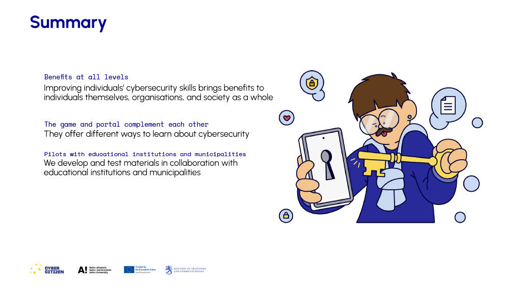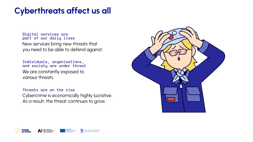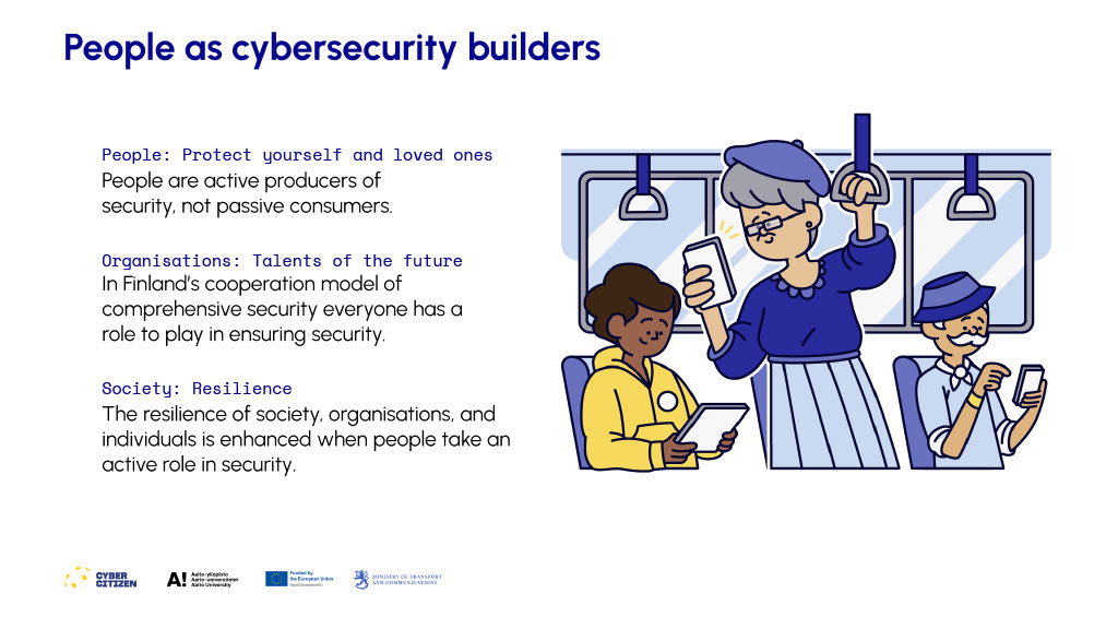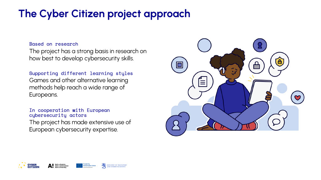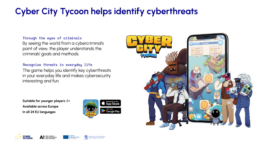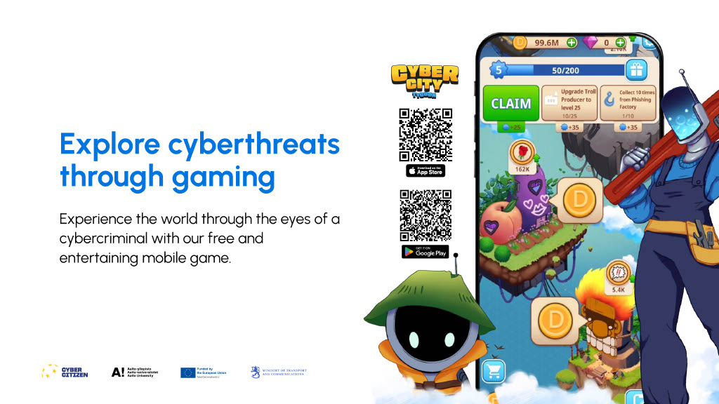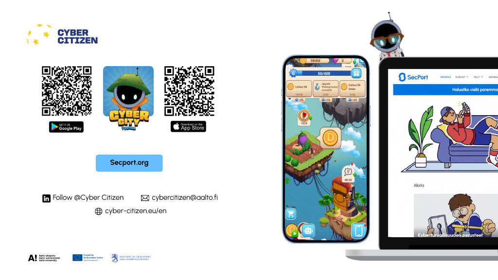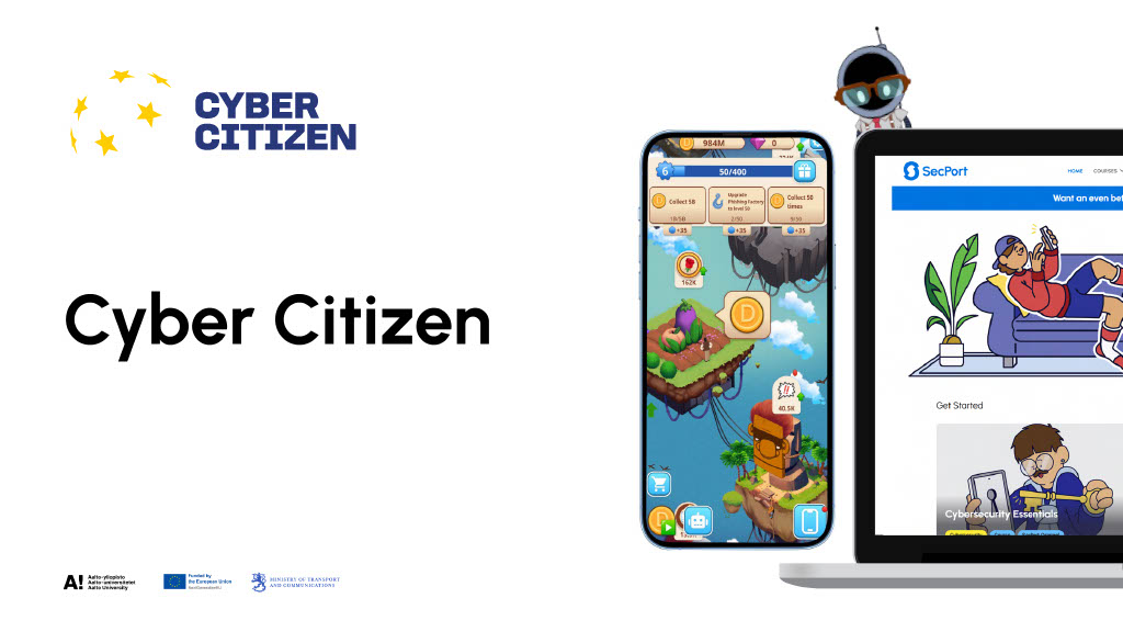 Cyber Citizen brings cybersecurity into everyday life. Everyone can develop their cybersecurity skills through the project’s learning portal materials and mobile game. The project is carried out by Aalto University and has been funded by the European Union’s NextGenerationEU programme and Finland’s Ministry of Transport and Communications.