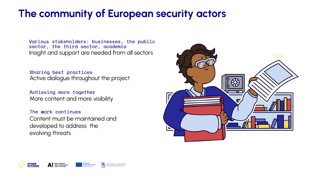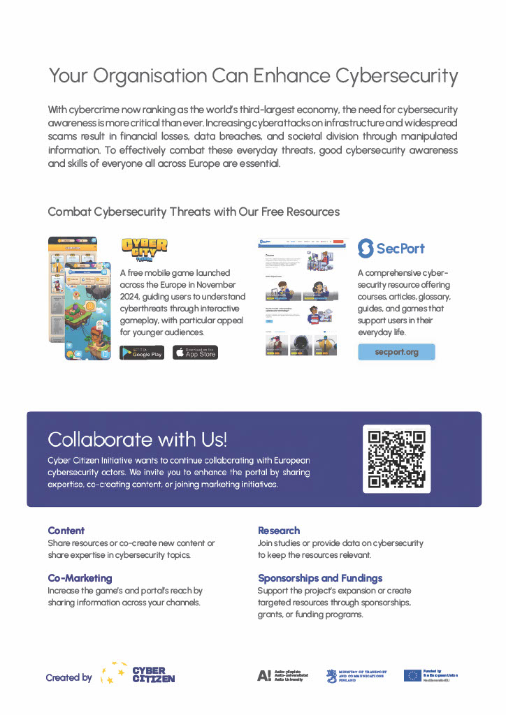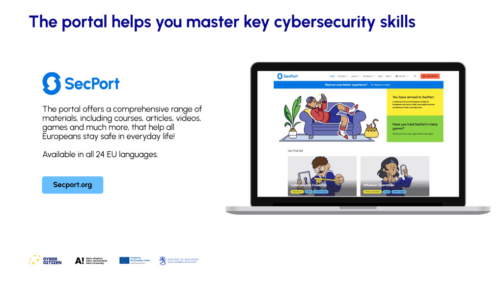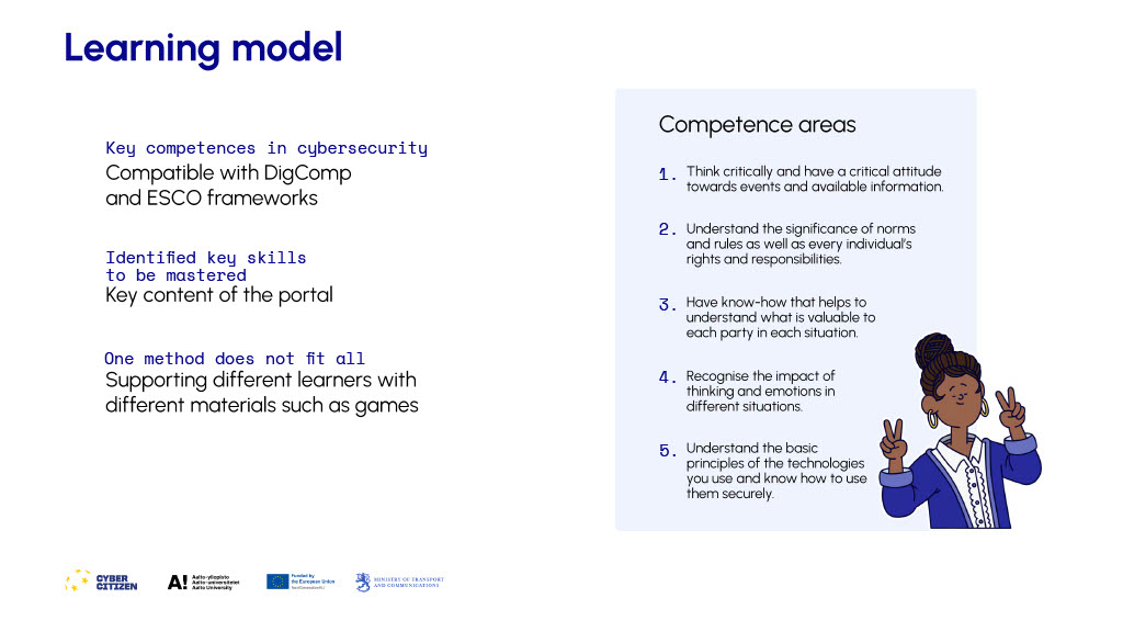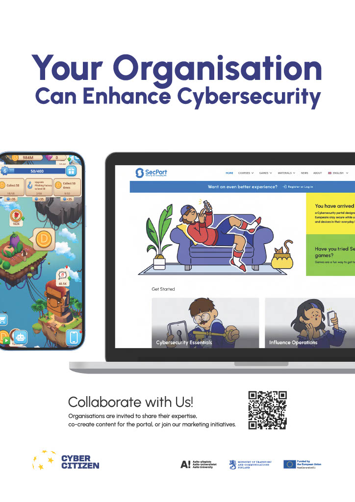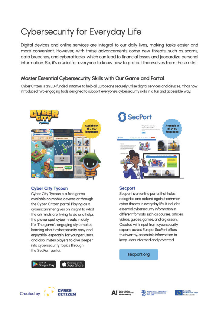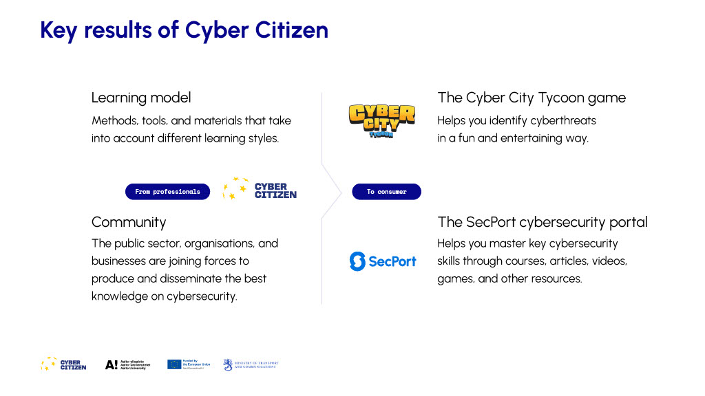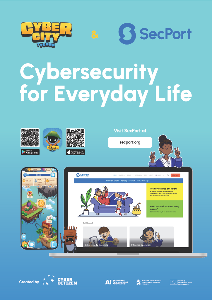 Cyber Citizen brings cybersecurity into everyday life. Everyone can develop their cybersecurity skills through the project’s learning portal materials and mobile game. The project is carried out by Aalto University and has been funded by the European Union’s NextGenerationEU programme and Finland’s Ministry of Transport and Communications.