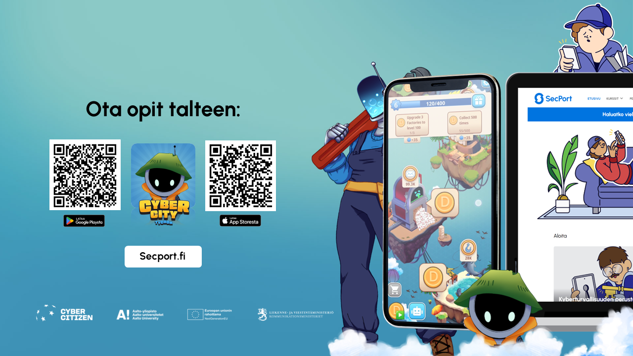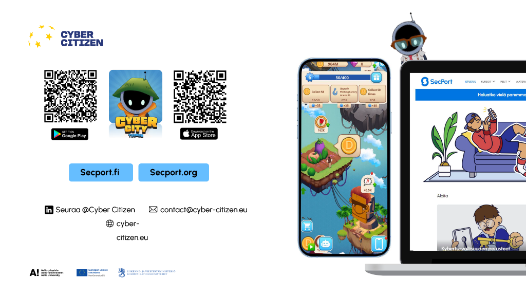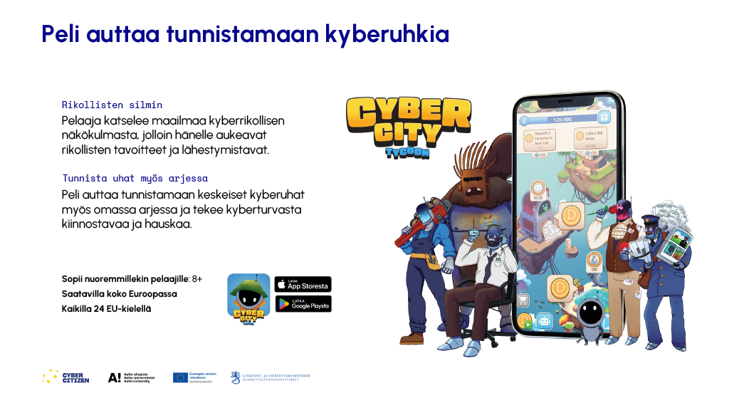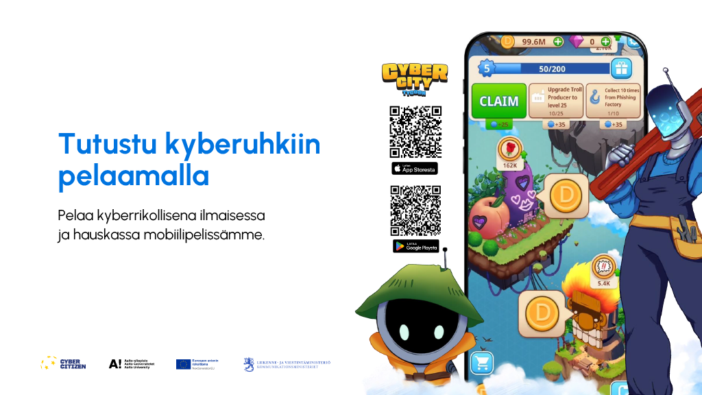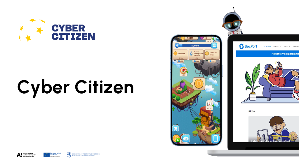 Cyber Citizen tuo kyberturvallisuutta arkeen. Jokainen voi kehittää kyberturvallisuustaitojaan hankkeen oppimisportaalin materiaalien ja mobiilipelin avulla. Hankkeen toteuttaja on Aalto-yliopisto ja hanketta on rahoittanut Euroopan unionin NextGenerationEU-ohjelma sekä liikenne- ja viestintäministeriö.