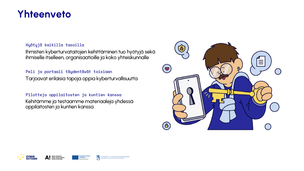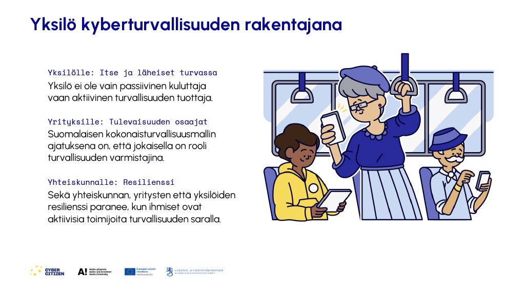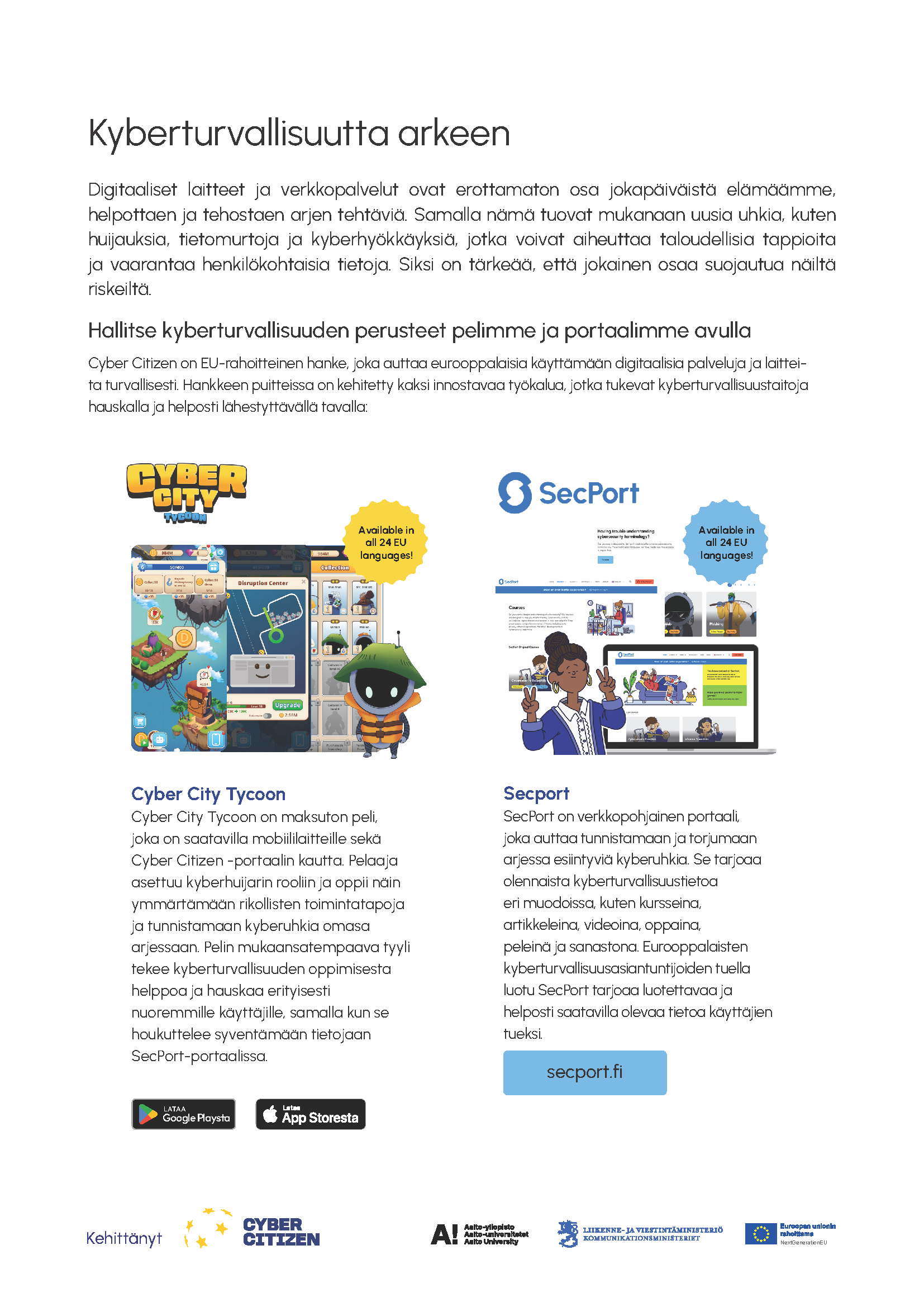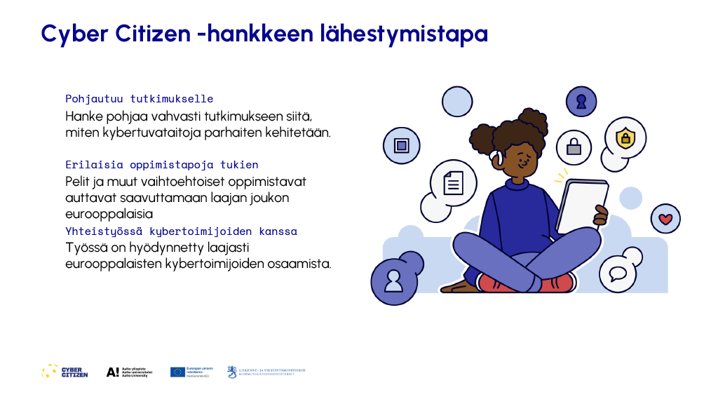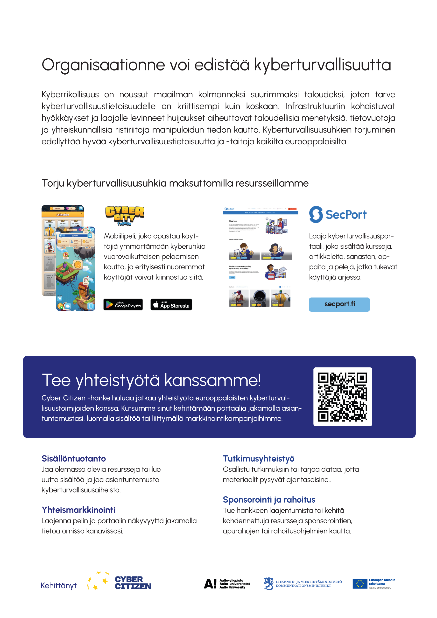 Cyber Citizen tuo kyberturvallisuutta arkeen. Jokainen voi kehittää kyberturvallisuustaitojaan hankkeen oppimisportaalin materiaalien ja mobiilipelin avulla. Hankkeen toteuttaja on Aalto-yliopisto ja hanketta on rahoittanut Euroopan unionin NextGenerationEU-ohjelma sekä liikenne- ja viestintäministeriö.