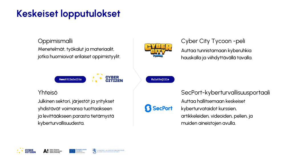 Hankkeessa on tuotettu mobiilipeli ja koulutusportaali, jotka tarjoavat välineitä jokaisen kyberturvallisuusosaamisen lisäämiseksi.