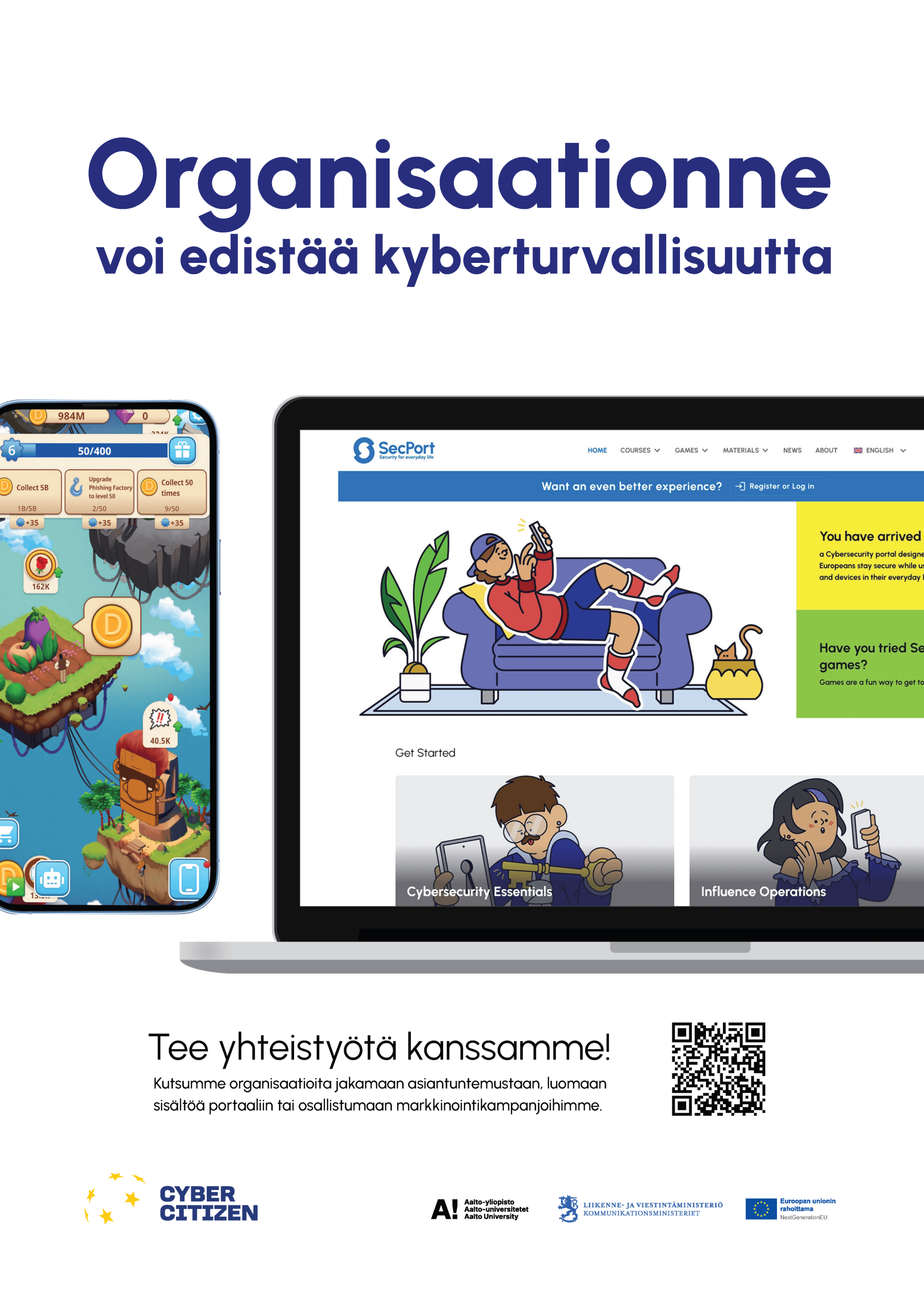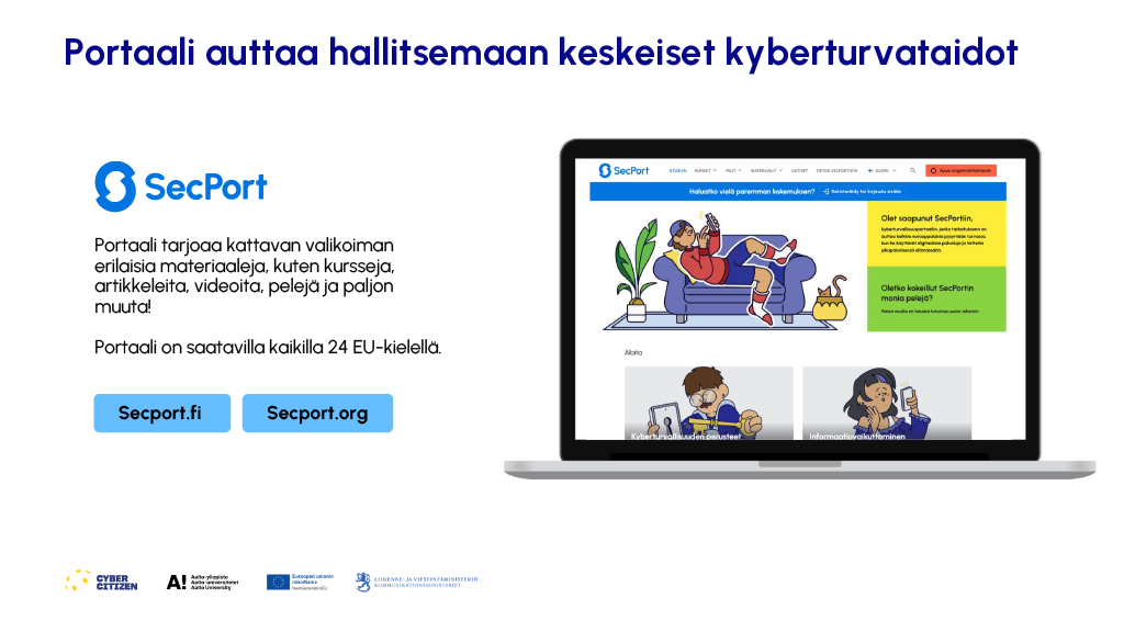 SecPort-koulutusportaali on nettisivu, josta löytyy kyberturvallisuutta opettavia koulutussisältöjä, kuten oppaita, videoita, artikkeleita, pelejä ja kursseja. Sivulta löytyvät esimerkiksi kyberturvallisuuden perusteet ja informaatiovaikuttamisen kurssit sekä kansantajuinen kyberturvallisuussanasto. https://www.secport.org/fi/